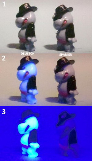 Body (Kopf, Arme und Beine) vollständig fluoreszierend unter UV-Licht. Auch der Rock und die Basis in Form eines Sterns. Spanien: