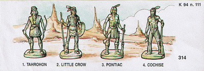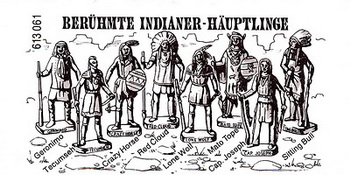 2 x 4 Figuren). 1. Auflage Deutschland 1984 "Berühmte Indianer-Häuptlinge" und 1985 "Berühmte Indianer-Häuptlinge II", 2 x 8 Figuren 2. Auflage Deutschland 1992 und 1993 jeweils "Berühmte Indianer-Häuptlinge", 2 x 8 Figuren 3. Auflage EU 1993 (nur die 8 Figuren aus dem Satz Berühmte Indianer-Häuptlinge II) 4. Auflage Argentinien 1995 (nur die 8 EU Figuren) Ebenfalls 1995 sind Figuren aus den ersten Serien "Westmänner" und "Indianer" im Maxi-Ei Italien als Figuren zum Wildwest-Fort erschienen. |