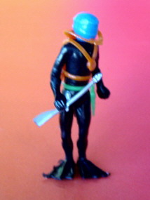 Zubehör: 1 Taucher steckbare Arme mit Fotoapparat, restliche Taucher jeweils mit zwei Zubehörteilen: Dreizack und Taschenlampe, Harpune und Messer, Stemmeisen und Pistole alle Figuren Gürtel mit Tauchermesser (ein Guss) |