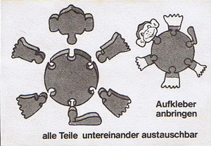 V1= Körper gelb, Gesicht blau, Arme gelb, Füße rot V2= Körper gelb, Gesicht gelb, Arme rot, Füße blau V3= Körper gelb, Gesicht rot, Arme blau, Füße gelb |