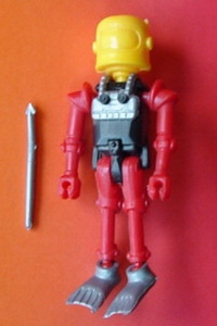 Zwei verschiedene Helme und Gasflaschen Körper schwarz Beine in rot oder grün Helm, Flossen, Waffe und Gasflasche auf der Brust in gelb oder silber |